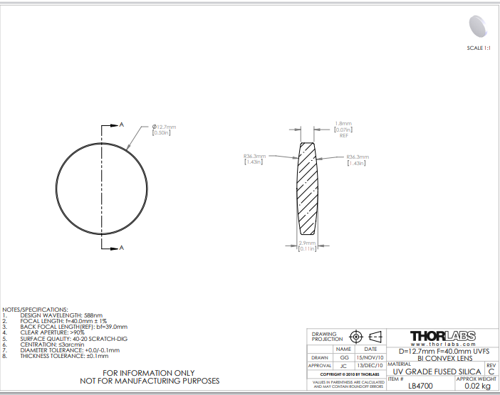 Thorlabs索雷博 LB4700 双凸透镜