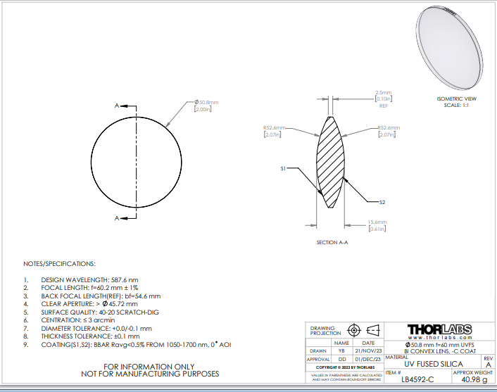 Thorlabs索雷博 LB4592-C 双凸透镜