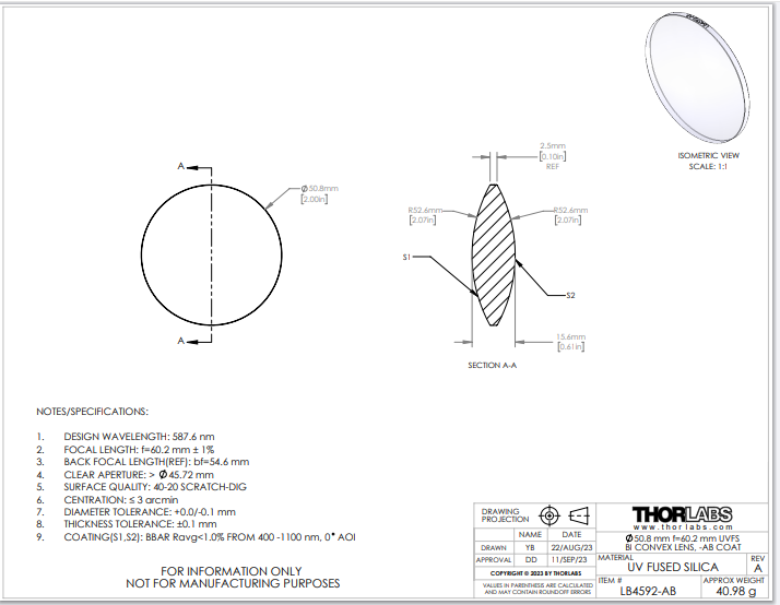 Thorlabs索雷博 LB4592-AB 双凸透镜