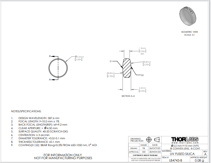 Thorlabs索雷博 LB4743-B 双凸透镜