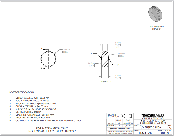 Thorlabs索雷博 LB4743-AB 双凸透镜