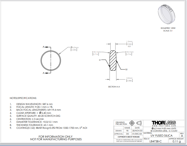 Thorlabs索雷博 LB4738-C 双凸透镜