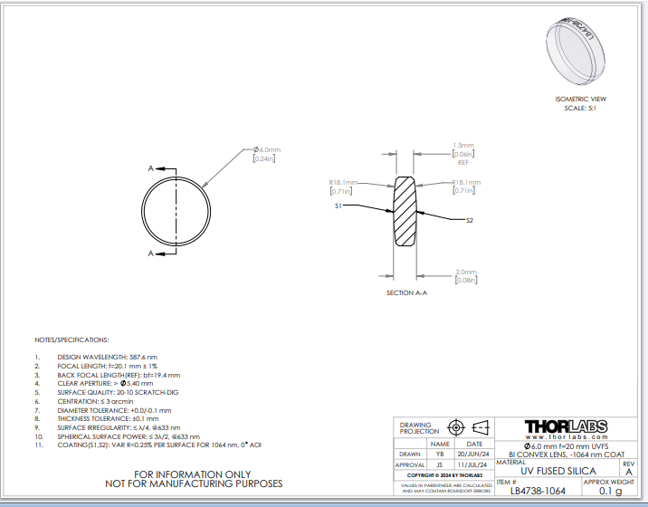 Thorlabs索雷博 LB4738-1064 双凸透镜