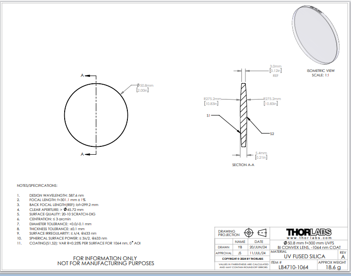 Thorlabs索雷博 LB4710-1064 双凸透镜