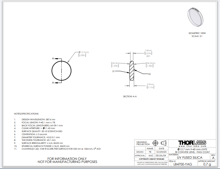 Thorlabs索雷博 LB4700-YAG 双凸透镜