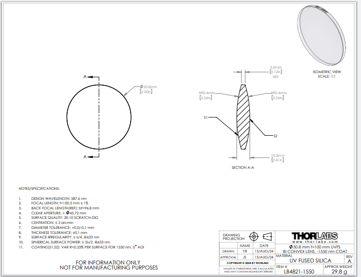 Thorlabs索雷博 LB4821-1550 双凸透镜
