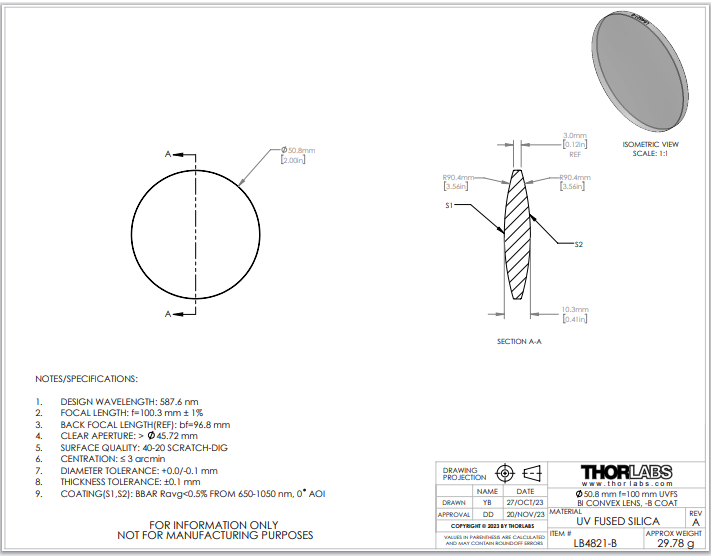Thorlabs索雷博 LB4821-B 双凸透镜