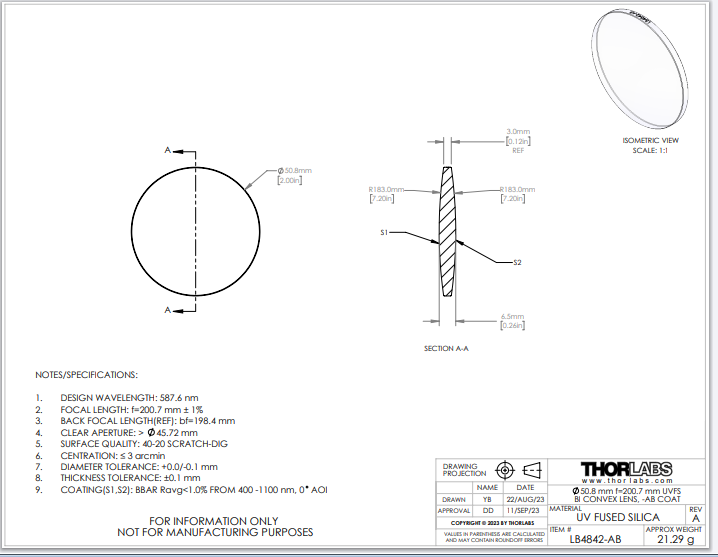 Thorlabs索雷博 LB4842-AB 双凸透镜