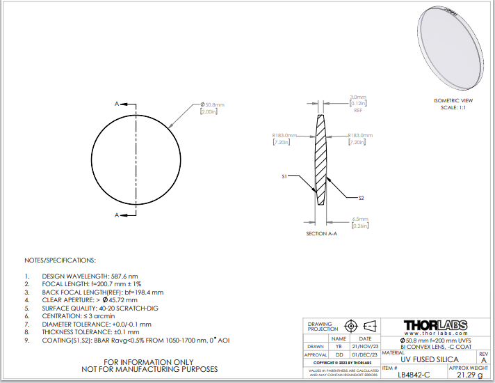 Thorlabs索雷博 LB4842-C 双凸透镜