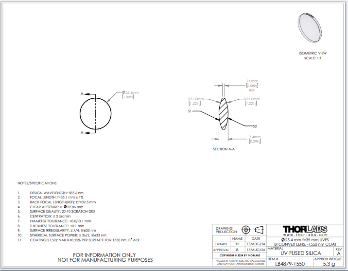 Thorlabs索雷博 LB4879-1550 双凸透镜