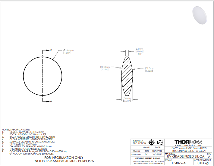Thorlabs索雷博 LB4879-A 双凸透镜