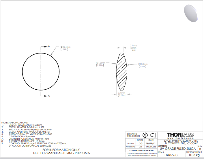 Thorlabs索雷博 LB4879-C 双凸透镜