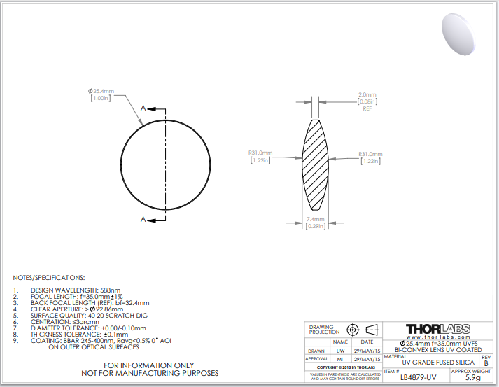 Thorlabs索雷博 LB4879-UV 双凸透镜