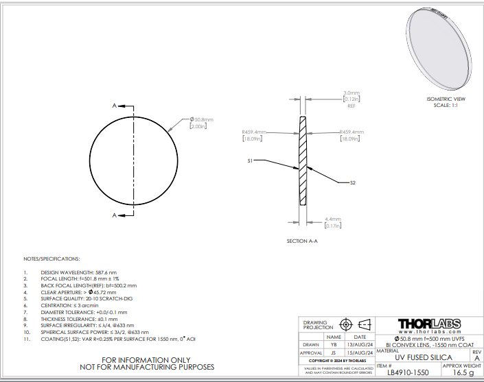 Thorlabs索雷博 LB4910-1550 双凸透镜