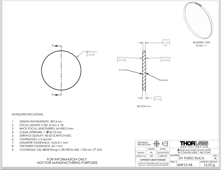 Thorlabs索雷博 LB4910-AB 双凸透镜