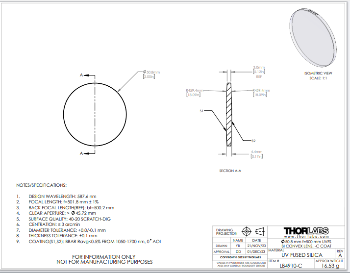 Thorlabs索雷博 LB4910-C 双凸透镜