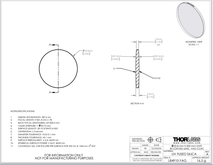 Thorlabs索雷博 LB4910-YAG 双凸透镜