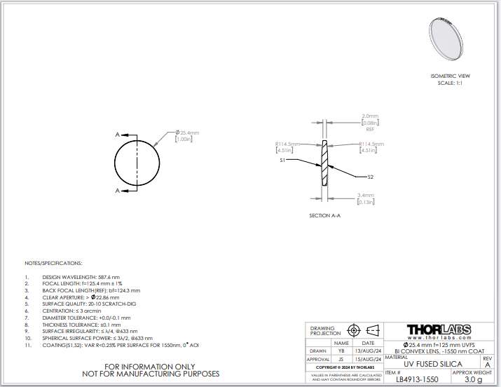 Thorlabs索雷博 LB4913-1550 双凸透镜