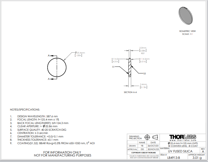 Thorlabs索雷博 LB4913-B 双凸透镜