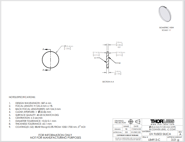 Thorlabs索雷博 LB4913-C 双凸透镜