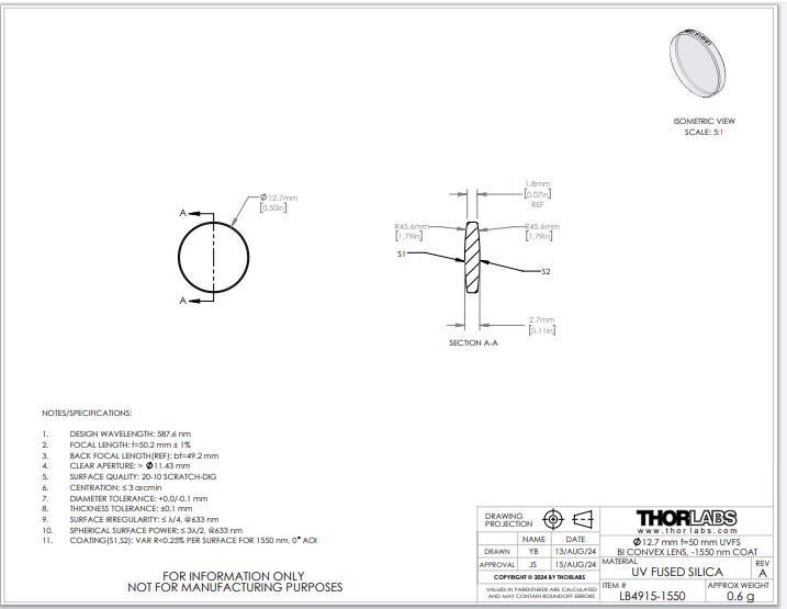Thorlabs索雷博 LB4915-1550 双凸透镜