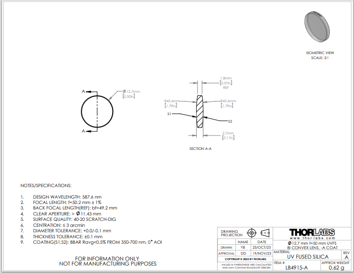 Thorlabs索雷博 LB4915-A 双凸透镜
