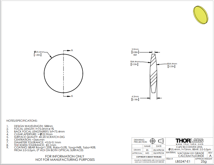 Thorlabs索雷博     LB5247-E1   双凸透镜