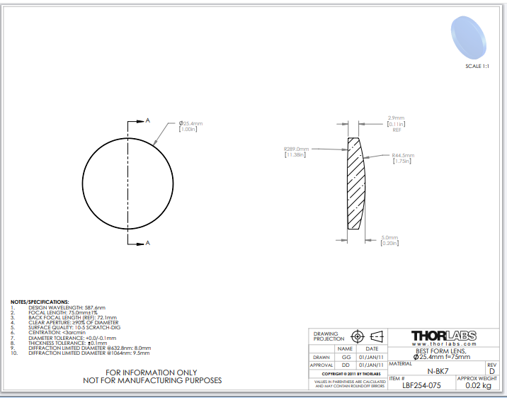 Thorlabs索雷博 LBF254-075 最佳外形透镜