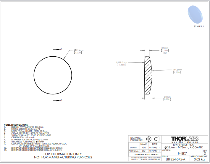 Thorlabs索雷博 LBF254-075-A 最佳外形透镜