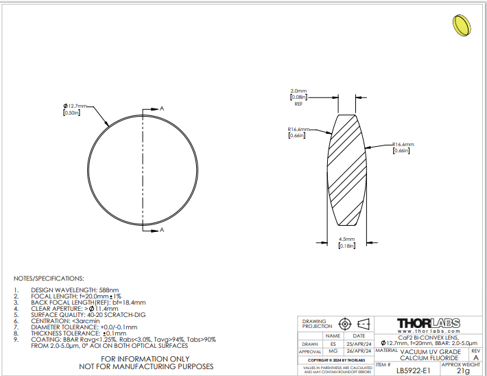 Thorlabs索雷博 LB5922-E1 双凸透镜
