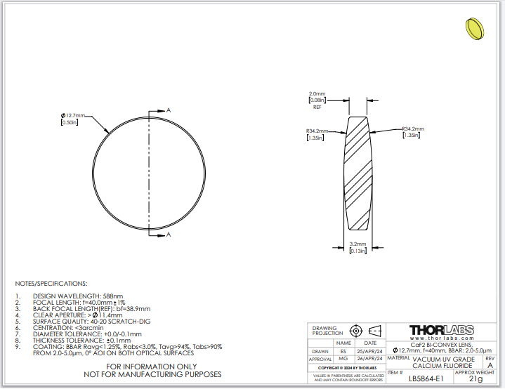 Thorlabs索雷博     LB5864-E1   双凸透镜