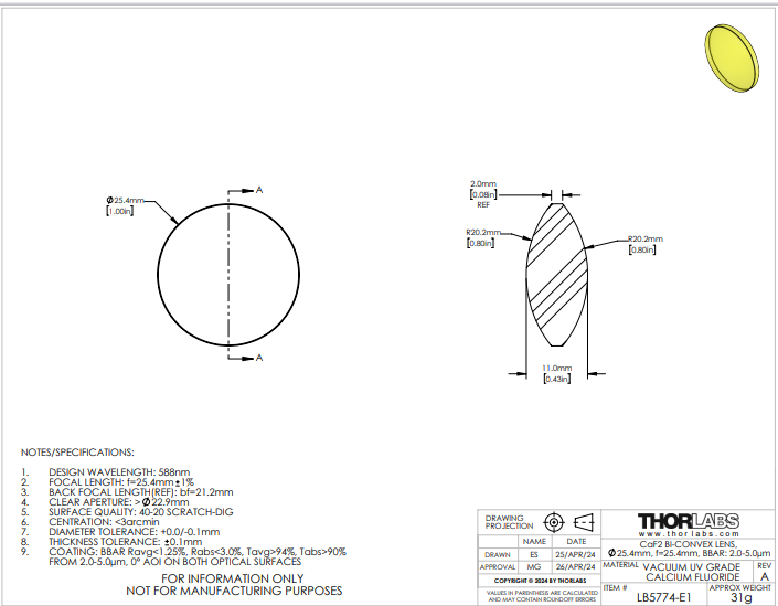 Thorlabs索雷博 LB5774-E1 双凸透镜