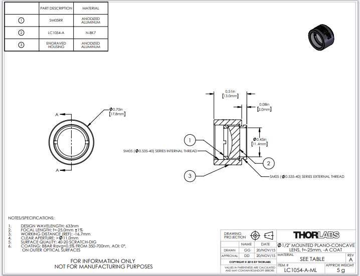 Thorlabs索雷博 LC1054-A-ML 平凹透镜