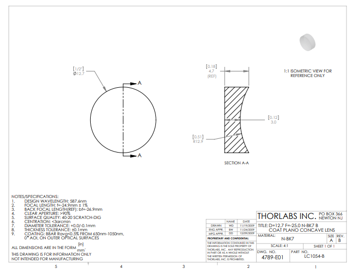 Thorlabs索雷博 LC1054-B 平凹透镜