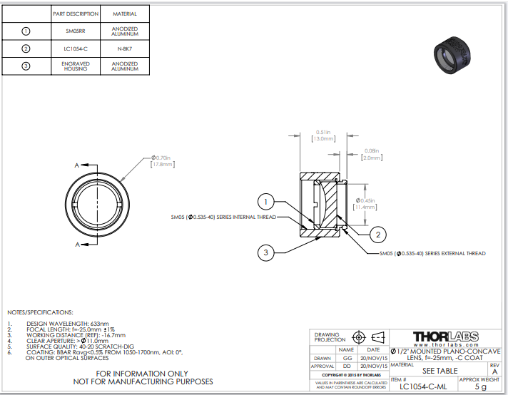 Thorlabs索雷博 LC1054-C-ML 平凹透镜