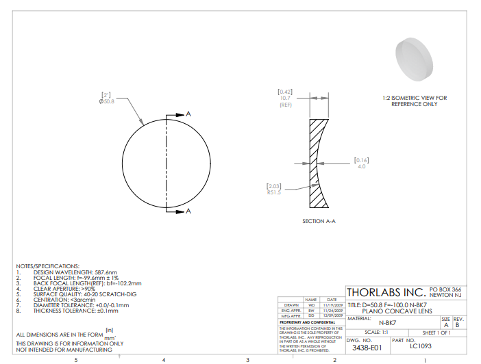 Thorlabs索雷博 LC1093 平凹透镜