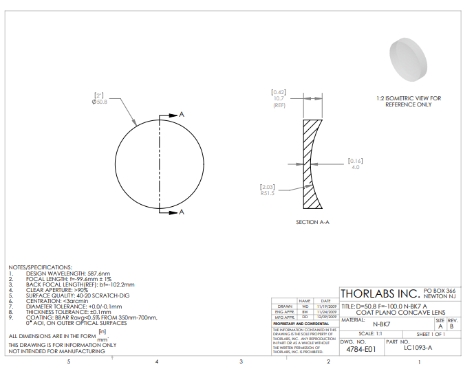 Thorlabs索雷博 LC1093-A 平凹透镜
