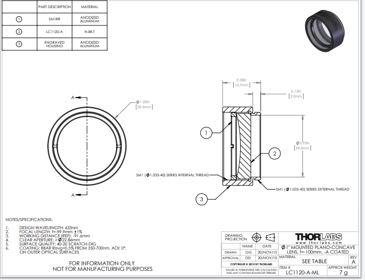 Thorlabs索雷博 LC1120-A-ML 平凹透镜