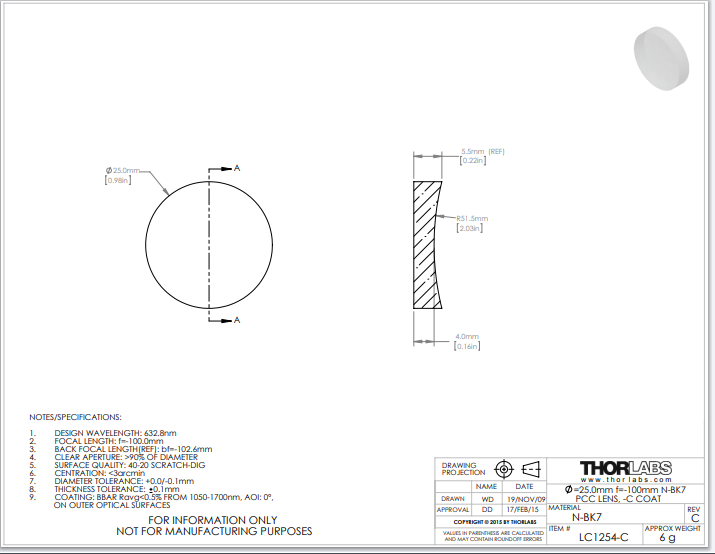 Thorlabs索雷博     LC1254-C   平凹透镜