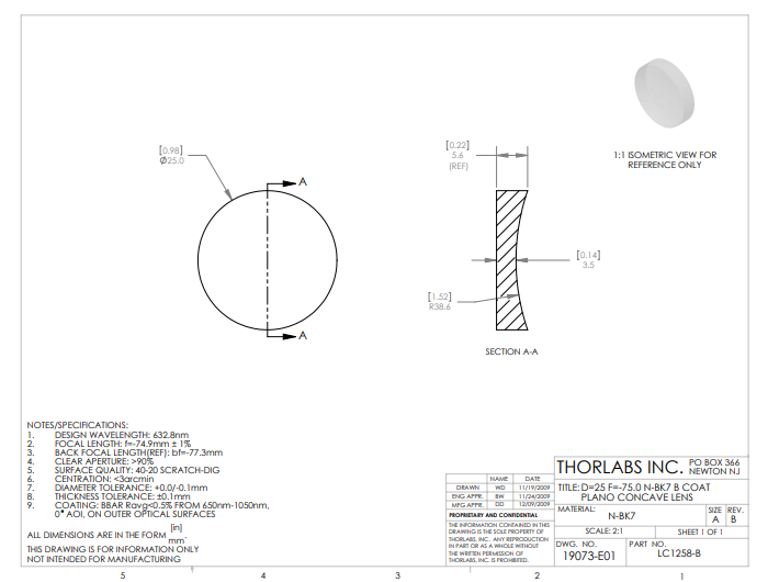Thorlabs索雷博 LC1258-B 平凹透镜