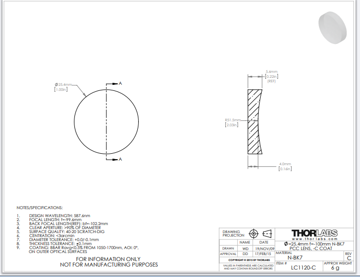 Thorlabs索雷博 LC1120-C 平凹透镜