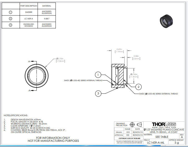 Thorlabs索雷博 LC1439-A-ML 平凹透镜