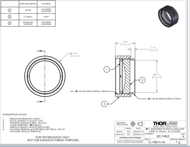 Thorlabs索雷博 LC1582-A-ML 平凹透镜