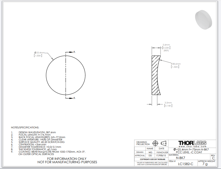 Thorlabs索雷博 LC1582-C 平凹透镜