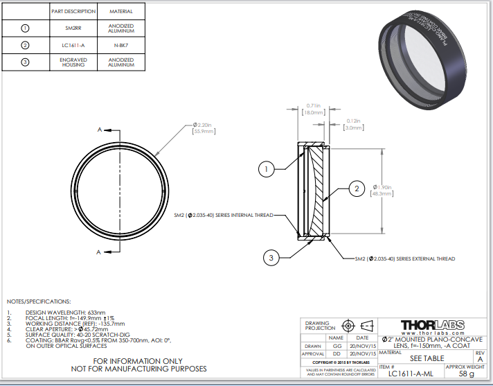 Thorlabs索雷博     LC1611-A-ML   平凹透镜