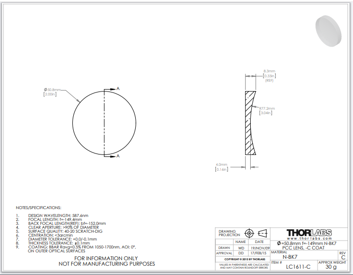 Thorlabs索雷博     LC1611-C   平凹透镜