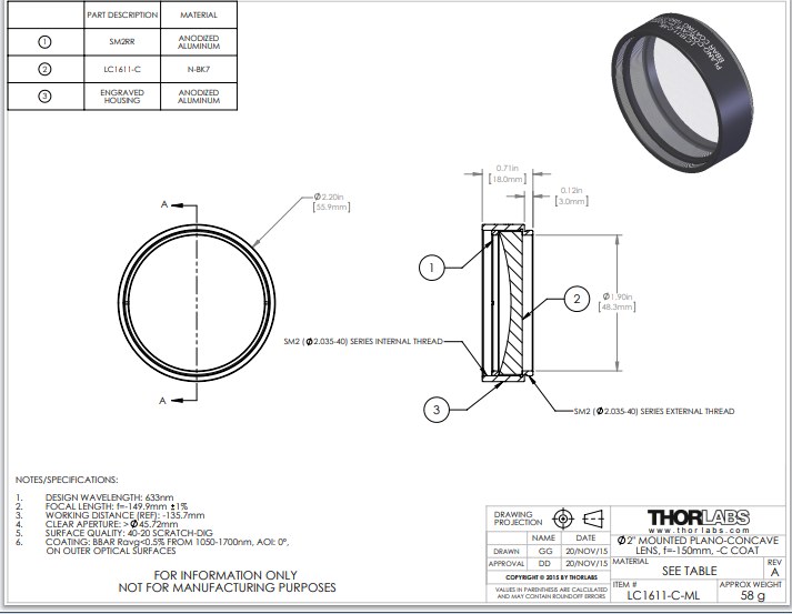 Thorlabs索雷博 LC1611-C-ML 平凹透镜