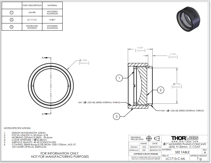 Thorlabs索雷博 LC1715-C-ML 平凹透镜