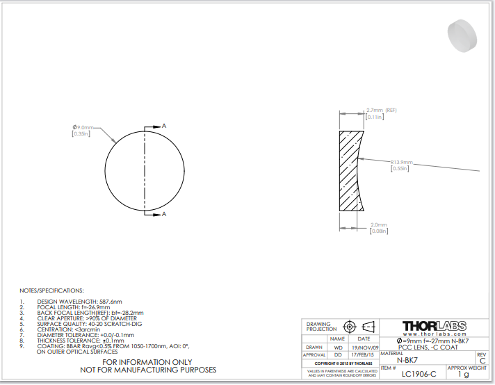 Thorlabs索雷博 LC1906-C 平凹透镜