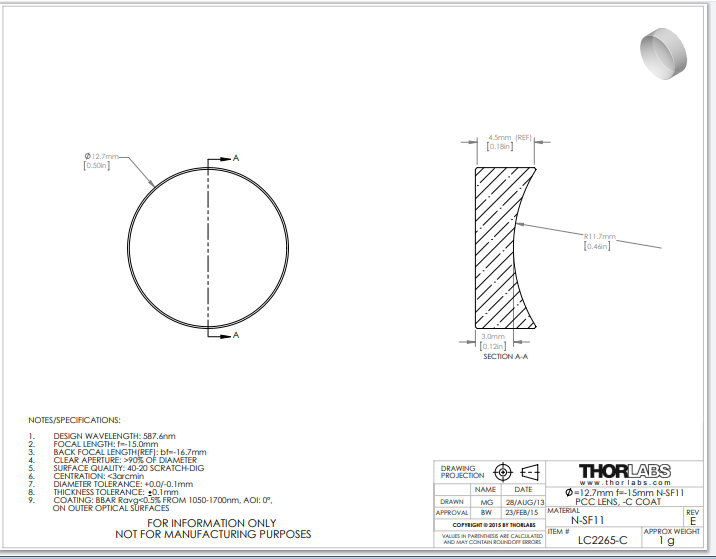 Thorlabs索雷博     LC2265-C   平凹透镜